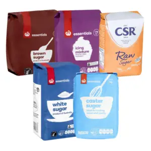 granulated sugar, brown sugar, caster sugar and icing sugar are commonly used for baking and to add sweetness to soups, pastas and curries;